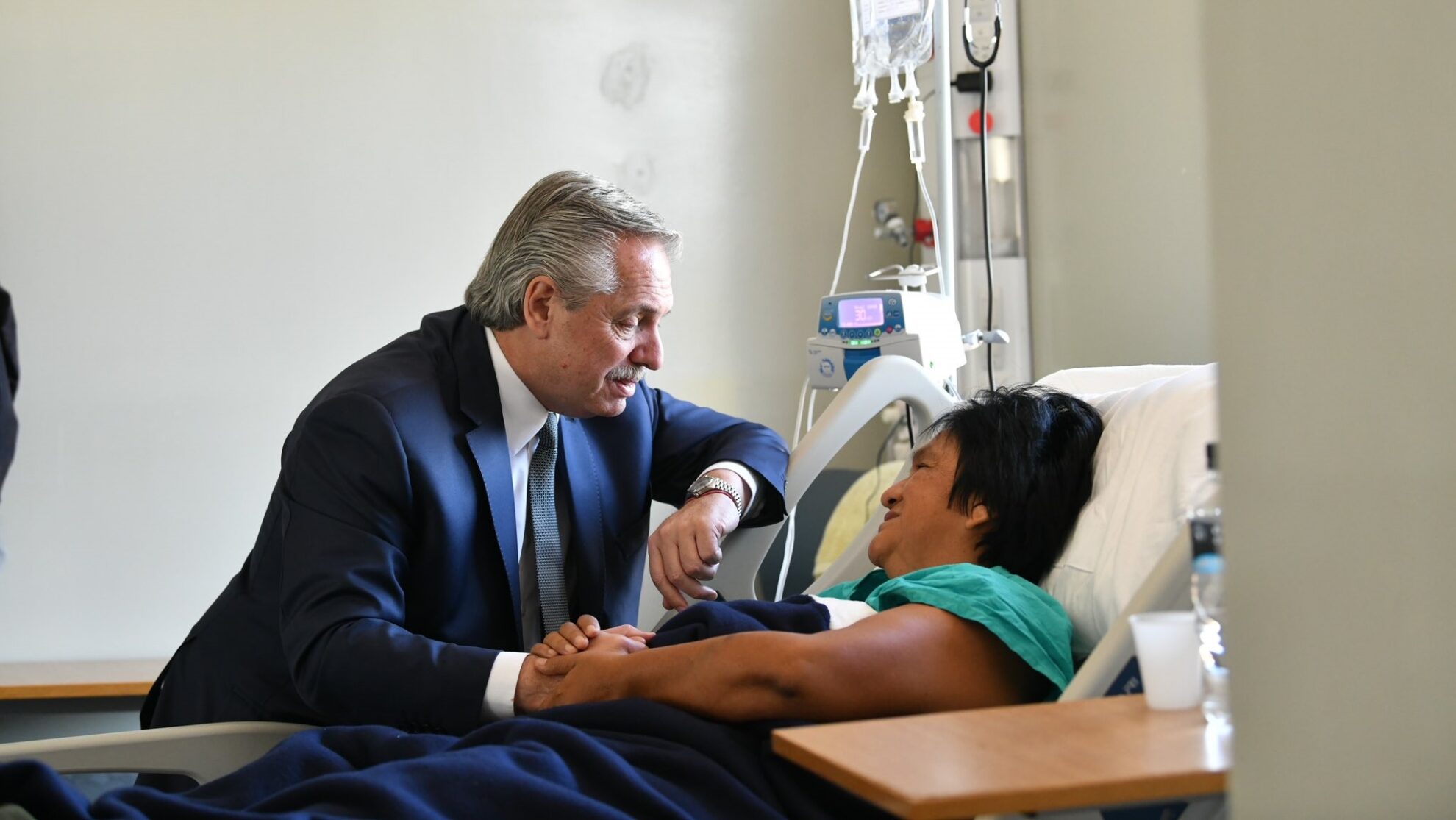 Fernández visitó a Sala por alrededor de una hora y estuvo sentado al lado de su cama en la Unidad Coronaria para conocer su estado de salud, tras llegar desde el aeropuerto ubicado en Perico al sanatorio Los Lapachos, en el barrio Gorriti de la capital jujeña, donde de a poco se fueron acercando militantes de organizaciones sociales para brindar su aliento a la líder de la Tupac Amaru y también al jefe de Estado.