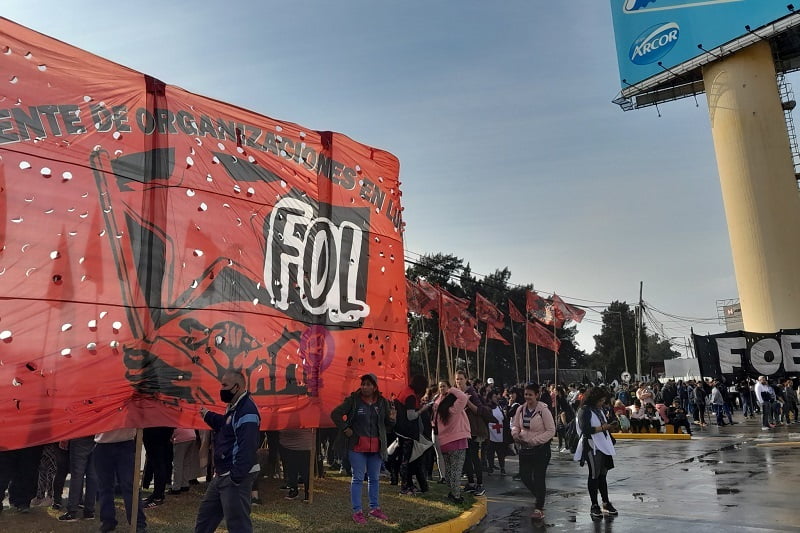 De la protesta participan militantes y referentes del Frente de Organizaciones en Lucha (FOL), el MTD Aníbal Verón, la Federación de Organizaciones de Base (FOB), el Movimiento Resistencia Popular (MRP), el Movimiento Teresa Rodríguez (MTR) y el Frente Popular Darío Santillán (FPDS).