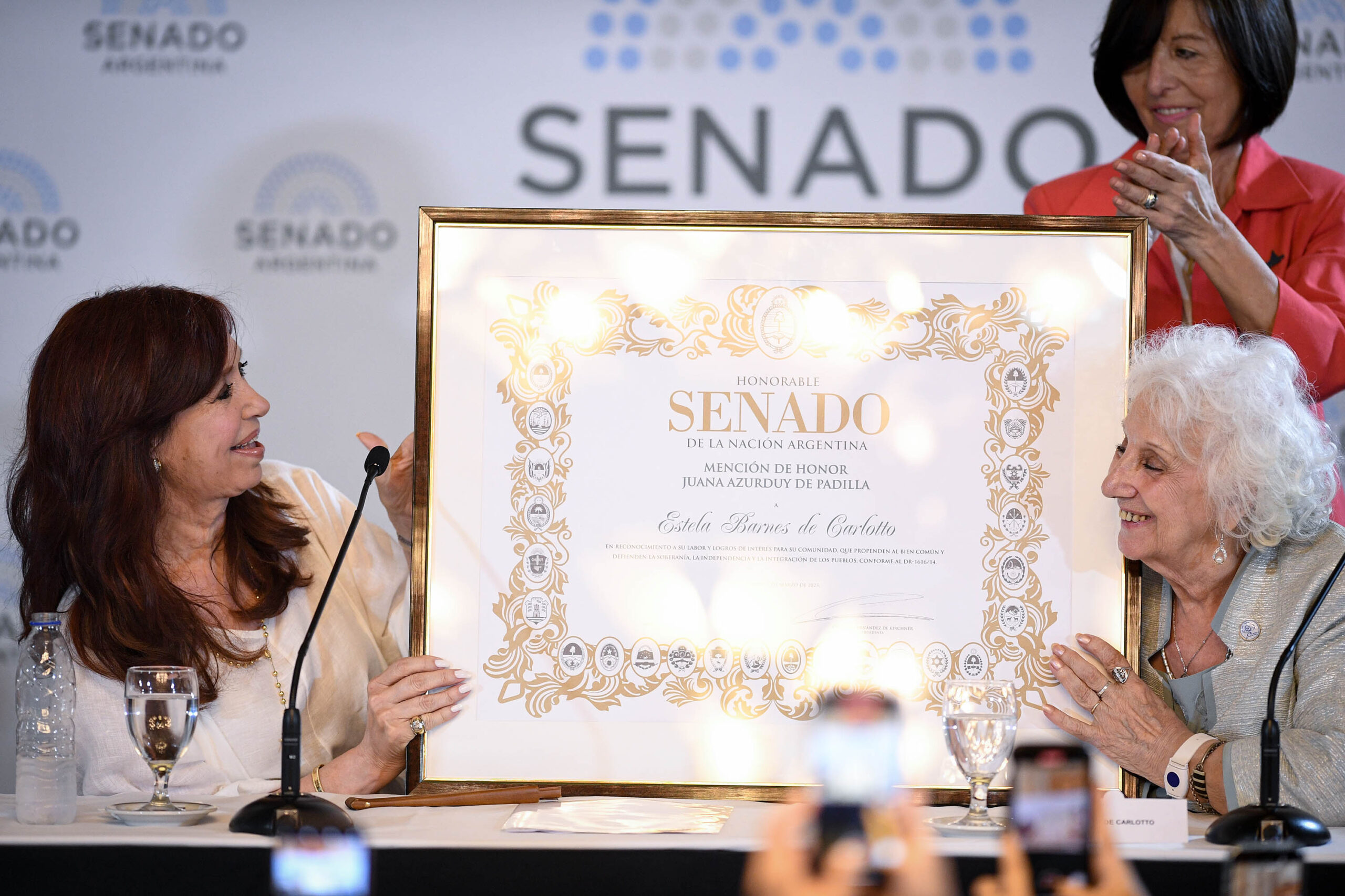 La Vicepresidenta se sumó al acto de homenaje a la titular de Abuelas de Plaza de Mayo, Estela de Carlotto, y otras integrantes de esa entidad que había sido motorizado por la senadora Nora del Valle Giménez, del Frente de Todos (FdT) de Salta.