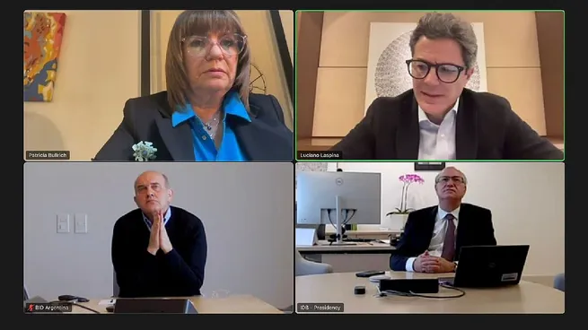 La candidata presidencial de Juntos por el Cambio (JxC), Patricia Bullrich, y uno de sus referentes económicos, Luciano Laspina, se reunieron de manera virtual con el presidente del Banco Interamericano de Desarrollo (BID), Ilan Goldfajn, y Agustín Aguerre, representante de la entidad en la Argentina.