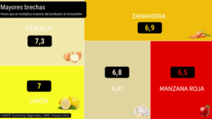 La cebolla (7,3 veces), el limón (7), la zanahoria (6,9), el ajo (6,8), la manzana roja (6,5 veces) fueron los cinco productos que presentaron mayor diferencia entre los precios de origen y destino.