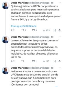 “Lamentablemente tengo que expresar mi decepción por la negativa de las autoridades del oficialismo provincial, en lo que se supone es la casa de debate legislativo, de realizar el evento el lunes a las 18 horas”, indicó el legislador en su cuenta de X.