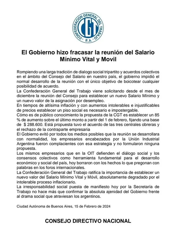 «Como es de público conocimiento, la propuesta de la CGT es establecer un 85% de aumento sobre el último monto a partir del 1 de febrero, fijando una base de $288.600. Esta propuesta tuvo el acuerdo de las tres centrales obreras y el rechazo de la contraparte empresaria», indicó la central en un comunicado publicado tras la reunión.