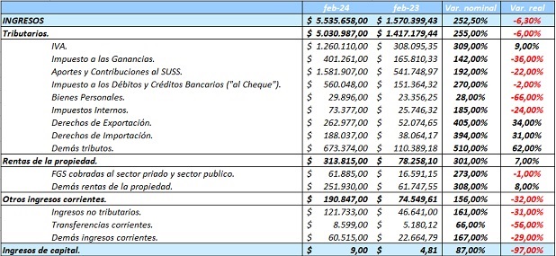 El impacto inflacionario también puede apreciarse en los ingresos fiscales y el crecimiento real (contemplando la inflación interanual, en torno al 260 %) de los tributos relacionados con el comercio exterior. Los derechos de exportación aumentaron un 34 %, los de importación un 31%, y “Demás tributos” (principalmente, Impuesto PAIS), un 62%. Fue la devaluación del 118 % inicial del nuevo Gobierno lo que explica esto, más el aumento nominal de la alícuota del Impuesto PAIS, y la comparación con un febrero de 2023 signado por los más de USD 20 mil millones menos de exportaciones producto de la sequía, que definen una base de comparación (febrero de 2023) deprimida, más que el resultado de una virtuosa política económica.