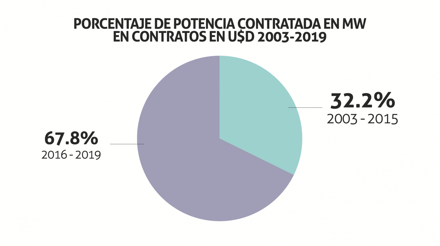Y esto es muy importante porque miren… Pero ahí no termina la cosa. Porque eso es lo estructural. El problema estructural de la energía producto de las privatizaciones pero, hay un problema contractual. Si ponemos por favor la primera filmina. No, pará pará. Porcentaje de potencia contratada en megavatios. En contratos ¿ven? Ahí estos son todos los contratos de generación son en dólares. Ahí está de 2003 al 2019. El precio hoy del megavatio generado se integra un 32,2% de contratos en dólares generados en nuestro periodo pero, como ustedes ven la mayoría del precio son por los contratos firmados entre 2016 y 2019.
