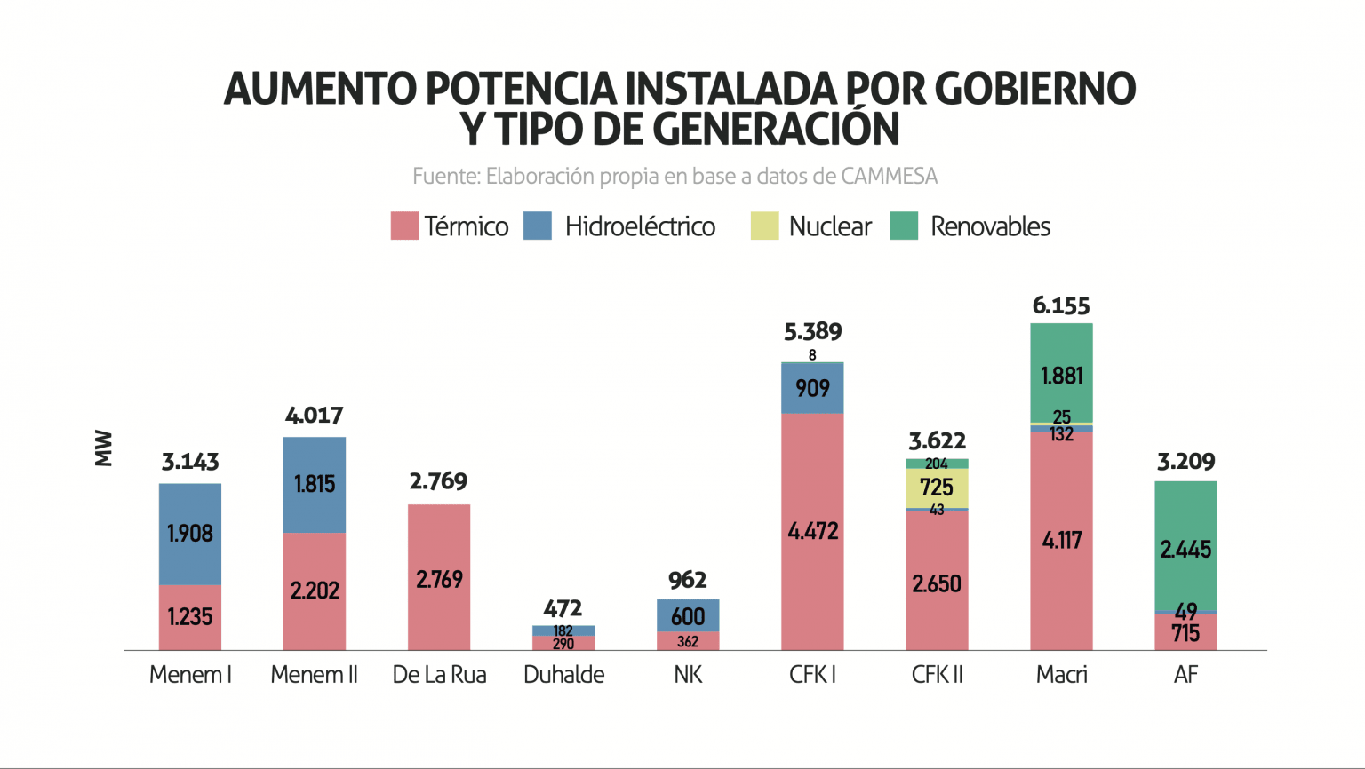 El rosita térmico, ese se hace con gas, el hidroeléctrico ya sabemos con agua, las represas, usinas, turbinas. Nuclear, que es la que incorporamos nosotros con Atucha II, 725 megavatios. Y renovable, controlen esto, fíjense en esto, renovables, las eólicas. ¿Se acuerdan aquel que andaba buscando y le recomendaba a un jugador de fútbol hacer contratos eólicos? Ahora les explico por qué.