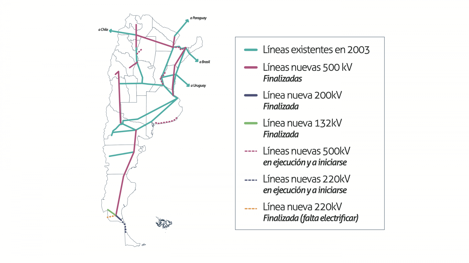 Fíjense: lo celeste son las líneas existentes al 2003, las bordeaux y las líneas punteadas son las que hicimos nosotros. ¿Cuál es el tema ahí? Como ustedes verán, hay una línea que sale de Choele Choel, Río Negro, va hasta el fondo, hasta Río Gallegos, Río Turbio, Calafate y hay una línea celeste. Esa línea celeste es Futaleufu que fue hecha durante la dictadura de Lanusse, es la que alimenta a Aluar. Aluar tiene el 60% de las acciones de esa hídrica.