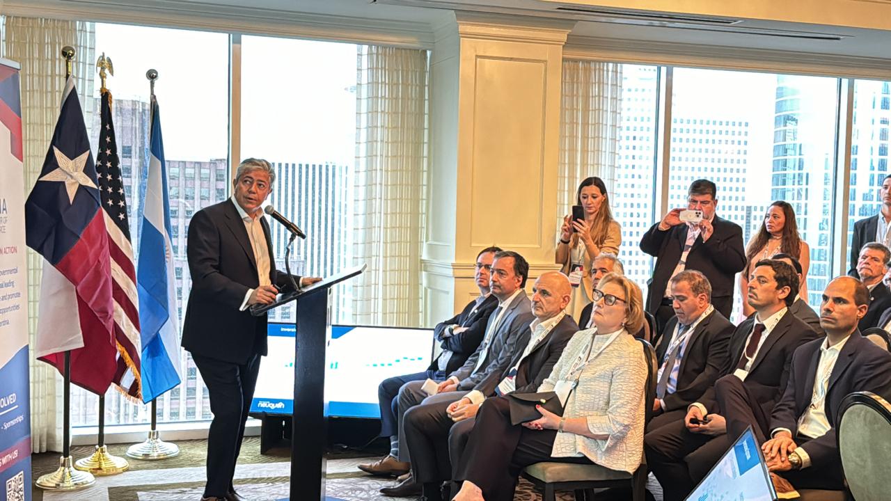 Antes de la presentación, Figueroa se reunió con los organizadores: Esteban Sánchez, Mariano Hasperue y Ariel Bossio, de la Cámara Argentino Texana; También participaron Daniel Feliciy Marcelo Gioffre, de Pan American Energy.