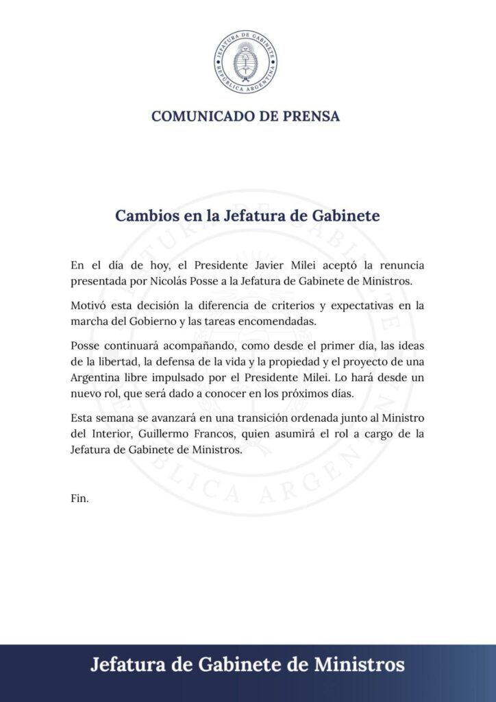 El Gobierno oficializó en el Boletín Oficial la salida de Nicolás Posse de la Jefatura de Gabinete y la designación de Guillermo Francos en su reemplazo. El ex jefe de Gabinete se va maltratado por el Presidente y se suma a una extensa lista de renunciados en menos de seis meses de gobierno.