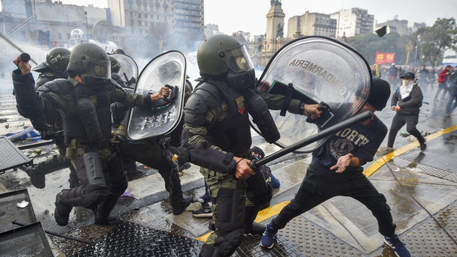 La fuerza porteña precisó que “hasta el momento se contabilizaron tres policías -dos mujeres y un hombres- heridos” y señaló que «una de las oficiales heridas recibió un objeto contundente desde un balcón en la esquina de la calle Salta y Avenida de Mayo, derivada al hospital Ramos Mejía con traumatismo de cráneo».