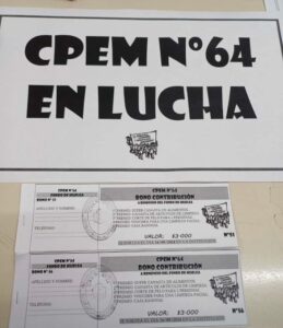 Domínguez exhibió en estas horas por sus redes sociales, un bono contribución del CPEM 64 de Neuquén capital, para un fondo de huelga, con premios para los compradores.