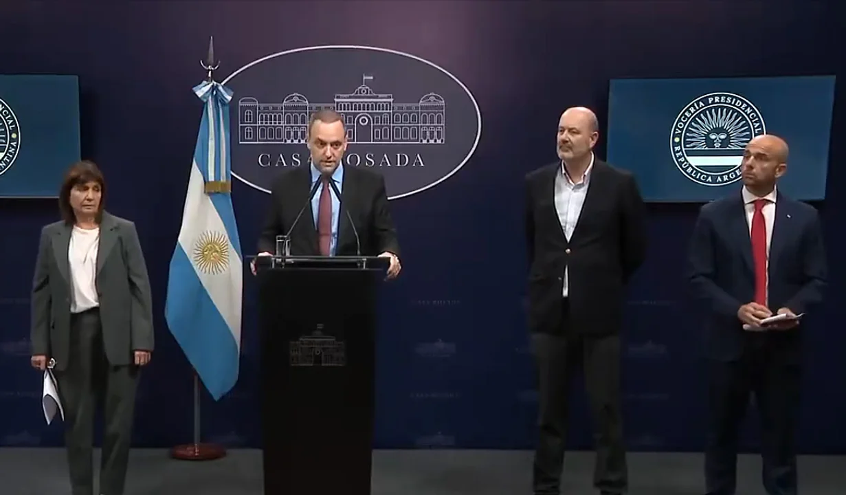 Durante el anuncio de la desregulación de Intercargo, el vocero presidencial estuvo acompañado por la ministra de Seguridad, Patricia Bullrich, el ministro de Desregulación, Federico Sturzenegger, y el secretario de Transporte, Franco Mogetta.