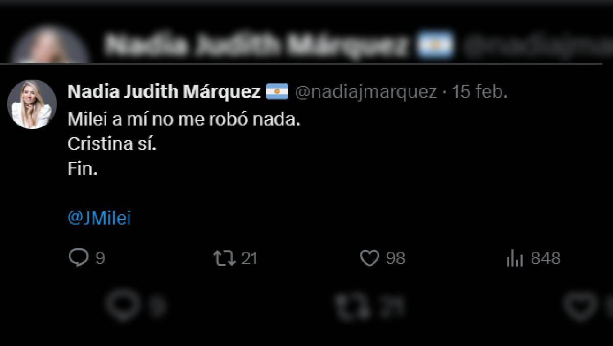 “A mí Milei no me robó nada, a Cristina sí. Fin.”. Con eso, intentó trasladar el foco a la corrupción del peronismo, dejando sin respuesta a los neuquinos que confiaron en las promesas de CoinX y $LIBRA.