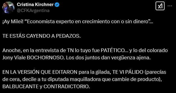 “¡Ay Milei! ‘Economista experto en crecimiento con o sin dinero’… TE ESTÁS CAYENDO A PEDAZOS. Anoche lo tuyo fue PATÉTICO”, disparó la exmandataria, quien también calificó de “bochornosa” la actuación del periodista Jonatan Viale.