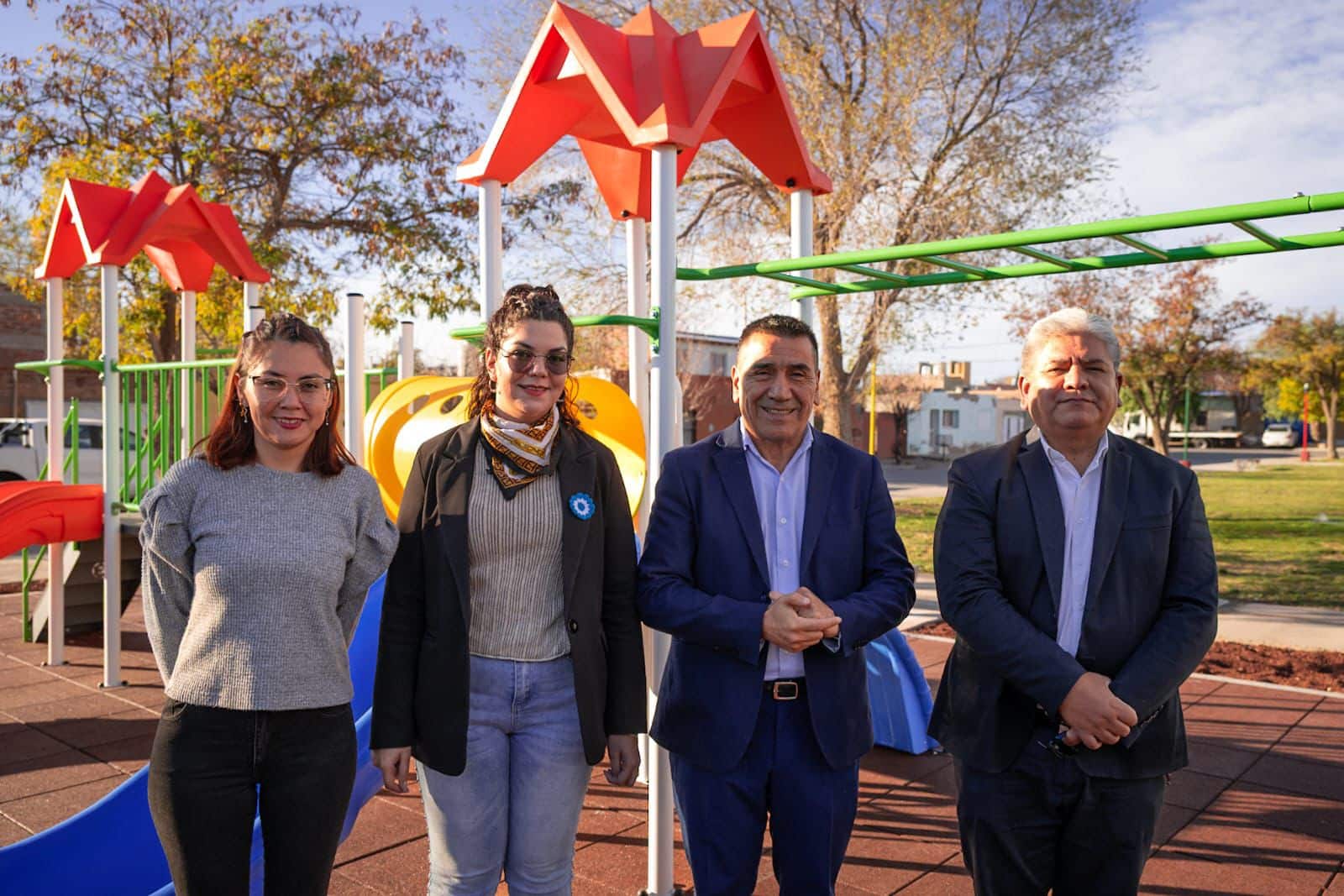 “Esta plaza comenzó como una cancha de fútbol precaria, luego la convertimos en una plaza, y hoy vemos un espacio moderno, con iluminación LED y juegos homologados para la seguridad de los niños”, señaló Rioseco durante la visita, en la que también estuvo presente la presidenta barrial Verónica Zapata.