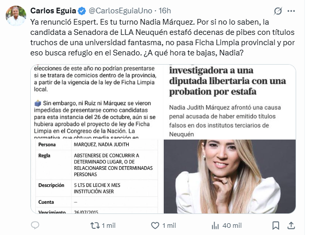 “La candidata a senadora de LLA Neuquén estafó decenas de pibes con títulos truchos de una universidad fantasma, no pasa Ficha Limpia provincial y por eso busca refugio en el Senado. ¿A qué hora te bajás, Nadia?”, disparó el periodista, dejando en evidencia la fractura dentro del espacio libertario.