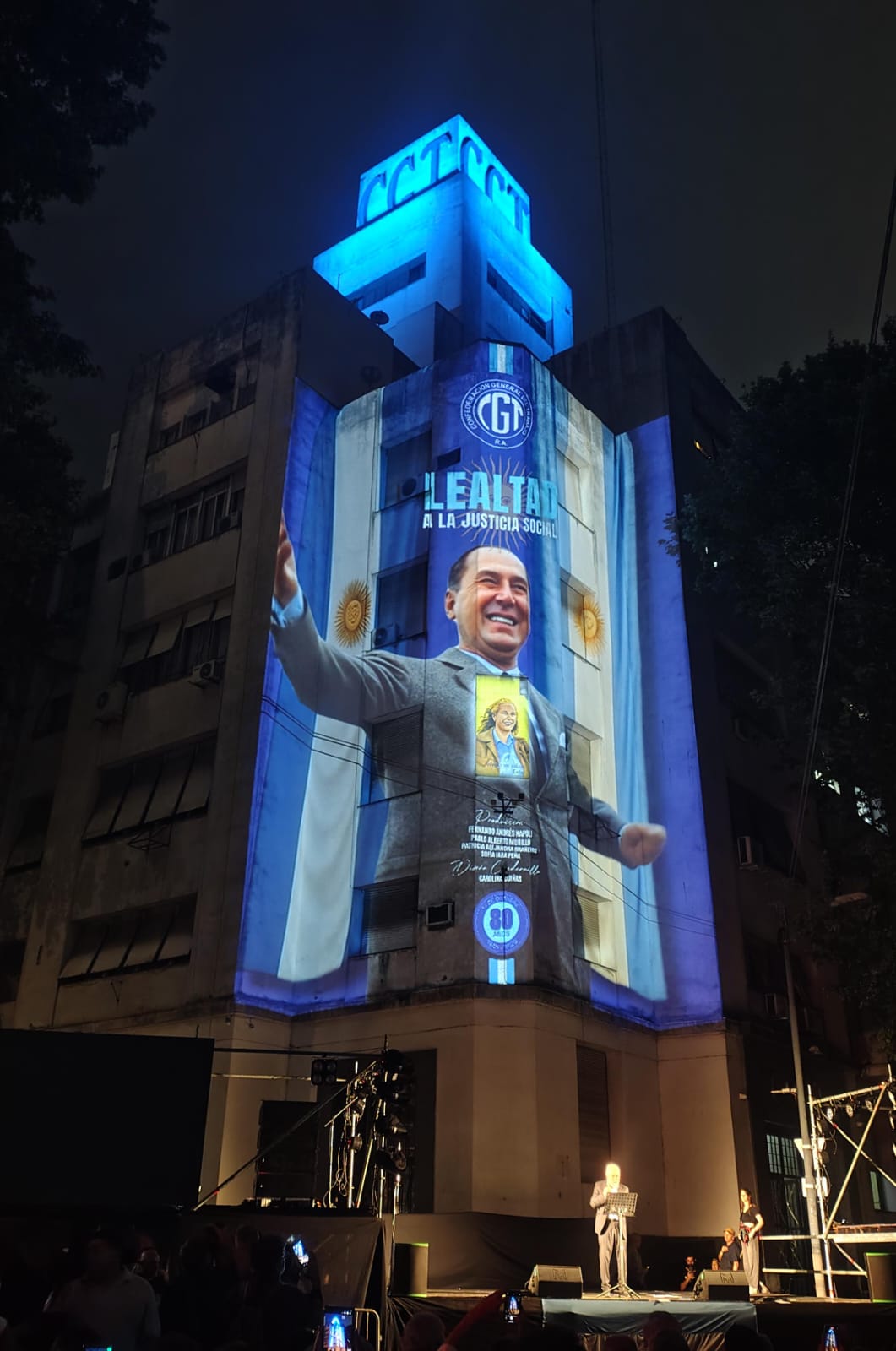 Al caer la noche, la CGT dio paso al momento central del acto con una proyección de mapping sobre la fachada del edificio de Azopardo. En las imágenes se intercalaron fragmentos históricos y discursos de Juan Domingo Perón, seguidos por militantes y afiliados de gremios como la UOCRA y UPCN.