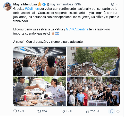 Una vez que se conocieron los resultados, la intendenta de Quilmes, Mayra Mendoza, volvió a insistir con el desdoblamiento en la provincia de Buenos Aires y en un posteo en redes sociales sostuvo que  el «conurbano salvará a la patria» y que «Cristina tenía razón».