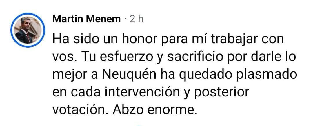 Su mensaje final fue correcto, institucional, sin estridencias. Agradeció a Martín Menem, a su bloque, a Karina Maureria (diputada electa por La Neuquinidad), a su familia y hasta destacó su trabajo “en sintonía” con Rolando Figueroa.