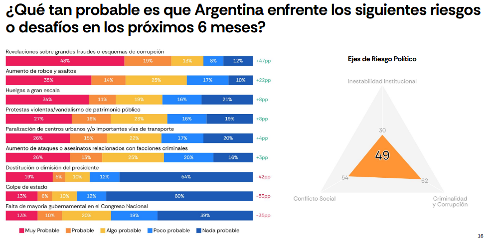 El componente de conflicto social cobra relevancia en el actual contexto de debate por la reforma laboral y protestas en el centro porteño. El indicador mide frecuencia e intensidad de protestas y movilizaciones , una variable que en Argentina tiene fuerte impacto político y que venimos anticipando en Política Viral.