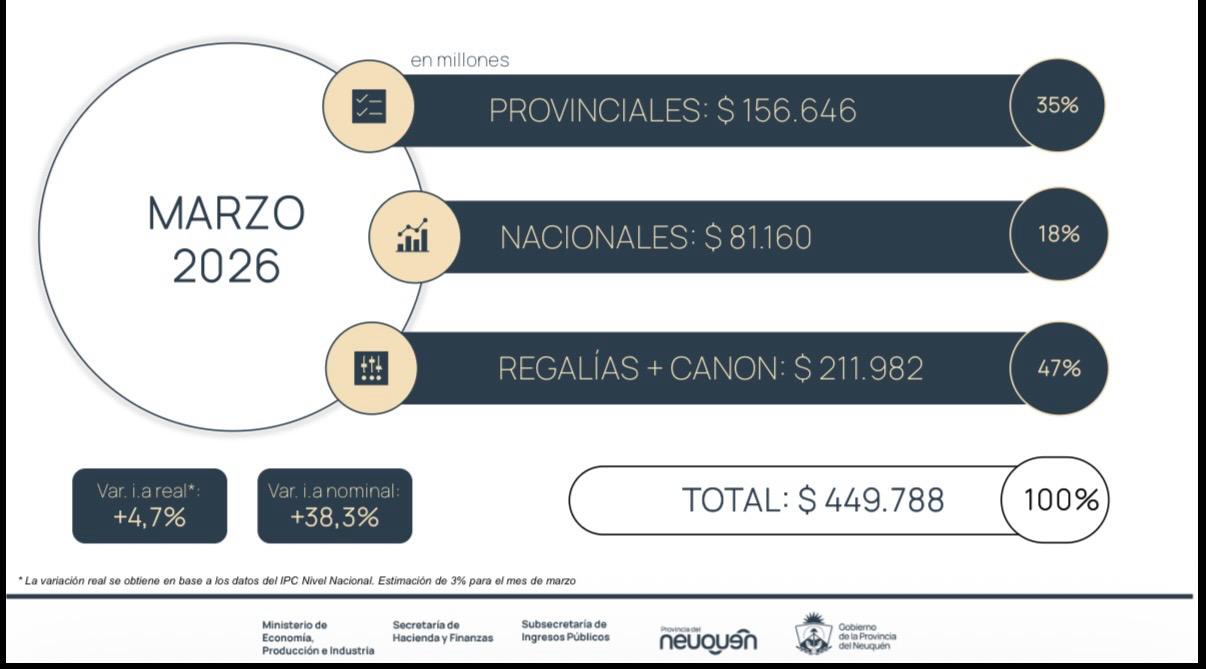El 47% de los recursos que entraron a Neuquén en marzo proviene de los hidrocarburos de Vaca Muerta, un 18% de Nación y un 35% de la recaudación provincial.