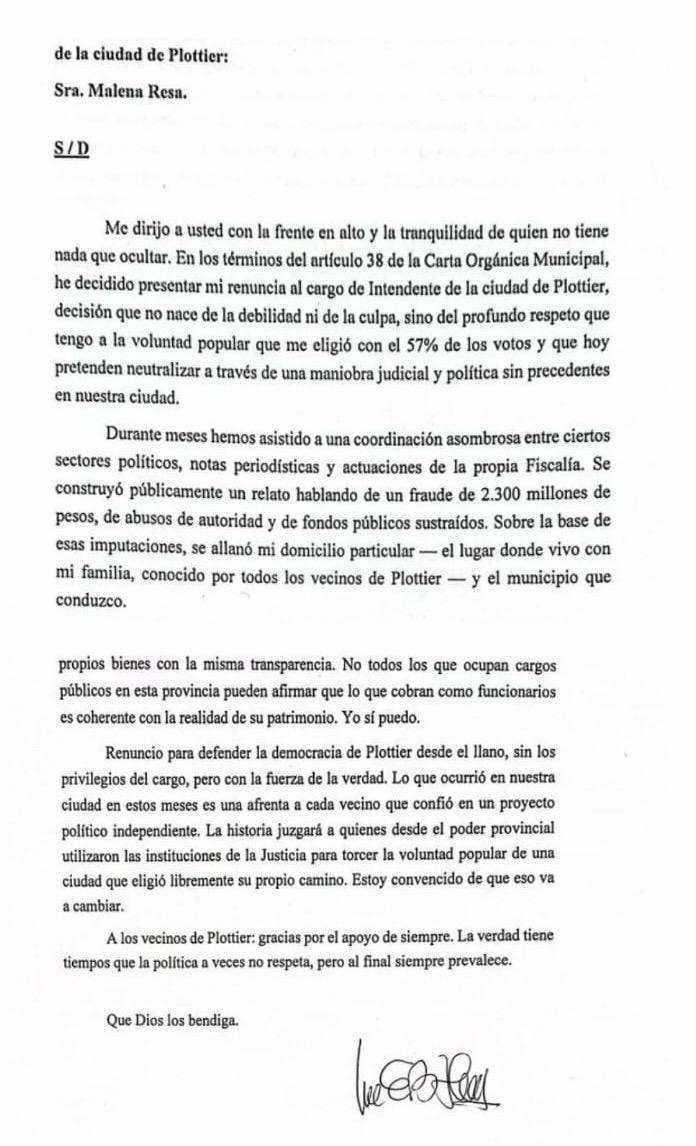 La renuncia, remarcó, tiene un objetivo político: “Renuncio para defender la democracia de Plottier desde el llano, sin los privilegios del cargo, pero con la fuerza de la verdad”. Y añadió que lo ocurrido en los últimos meses representa “una afrenta a cada vecino que confió en un proyecto político independiente”.